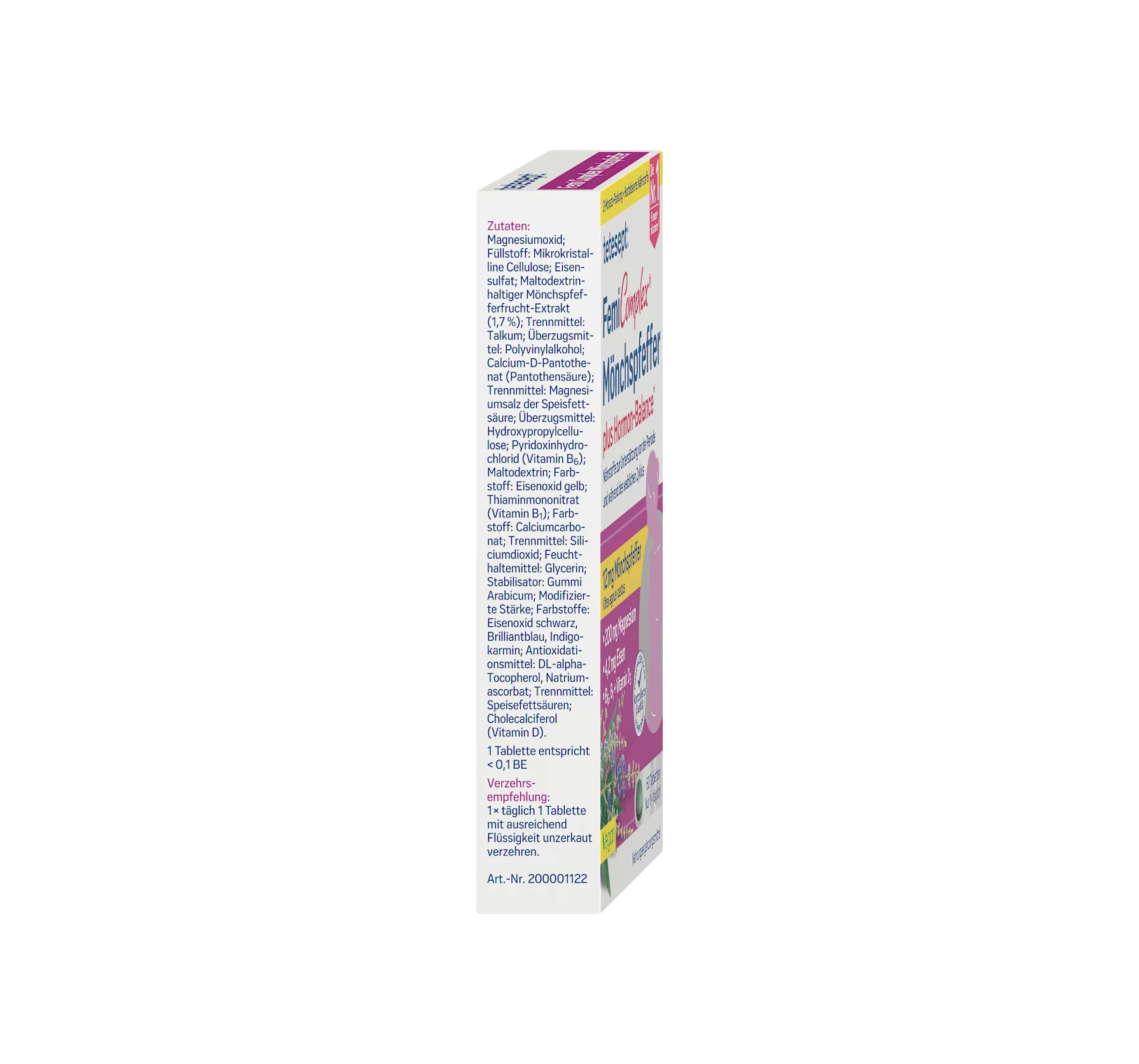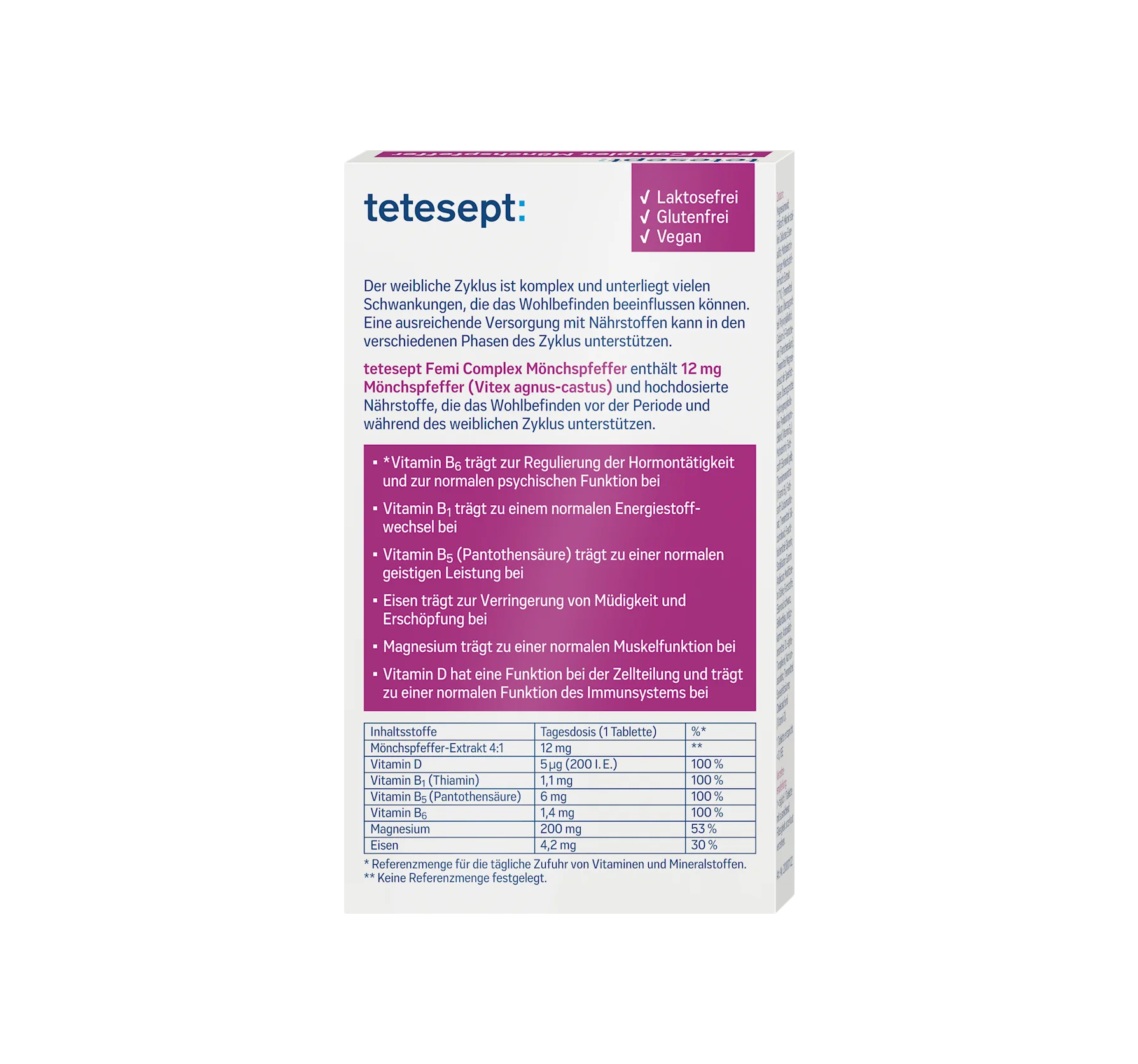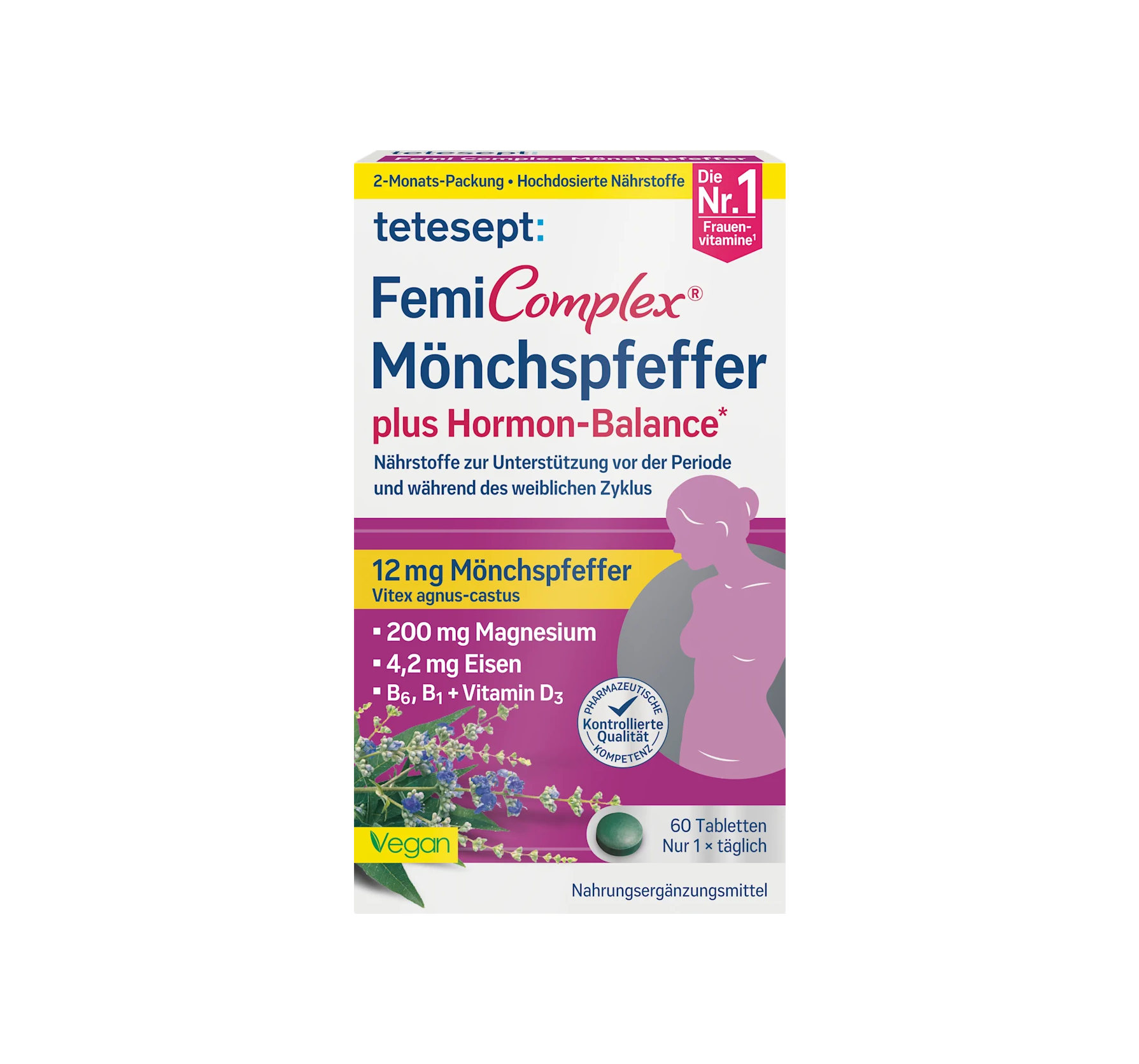 Tetesept 的 FemiComplex 聖潔莓錠劑採用特殊營養成分,旨在支持女性生理週期的各個階段。片劑含有 12 毫克聖潔莓以及其他營養成分,如鐵、維生素 B1、B5 和 B6。維生素 B6 有助於調節荷爾蒙活動和正常的身體機能。維生素 B3 則有助於維持正常的能量代謝,而維生素 B5 則有助於維持正常的腦力活動。其中的鐵元素還可以緩解疲勞感。這款膳食補充劑採用片劑形式,服用方...