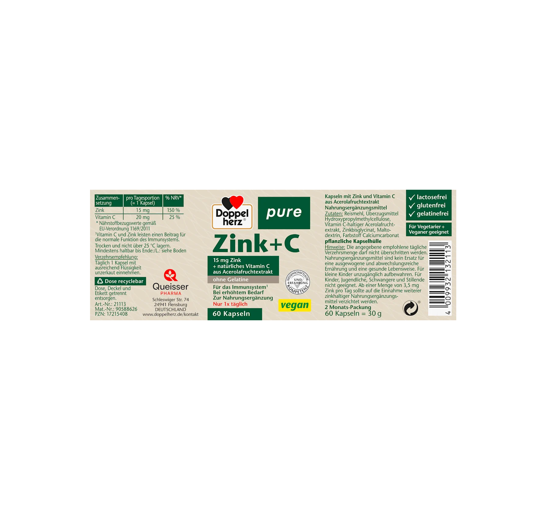 確切產品名稱:含來自西印度櫻桃果萃取物的鋅和維生素 C 的食品補充劑膠囊成分:米粉、上光劑羥丙基甲基纖維素、含維生素 C 的西印度櫻桃果萃取物、雙甘氨酸鋅、麥芽糊精、著色碳酸鈣、植物膠囊殼請注意有關過敏原的資訊。