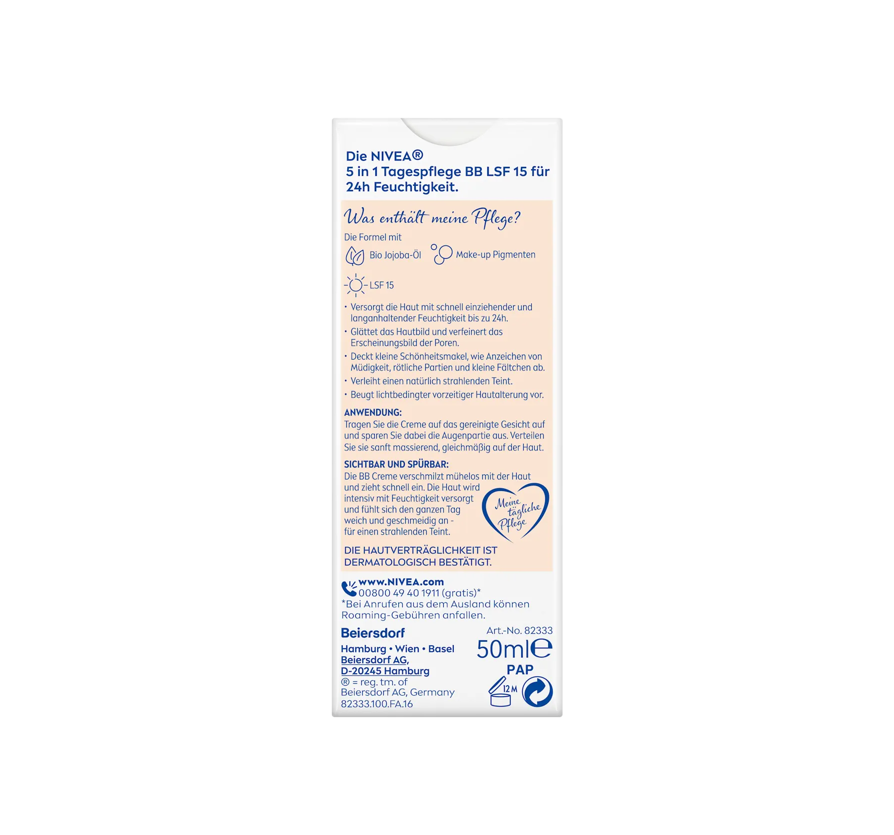 妮維雅 Essentials BB 五合一 24 小時保濕日霜,蘊含有機荷荷巴油和彩妝色素,為肌膚快速吸收,持久保濕長達 24 小時。這款有色日霜適合淺膚色,可遮蓋肌膚輕微瑕疵,例如疲勞、泛紅和細紋。它能撫平肌膚紋理,細緻毛孔。 SPF 15 防曬指數還能有效抵抗光老化。